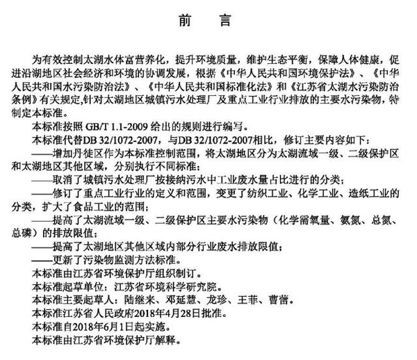 轉載請注明出處(太湖地區城鎮污水處理廠及重點工業行業主要水污染物排放限值(DB321072-2018):