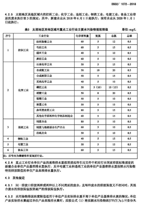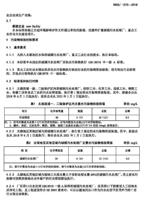 太湖地區城鎮污水處理廠及重點工業行業主要水污染物排放限值(DB321072-2018)