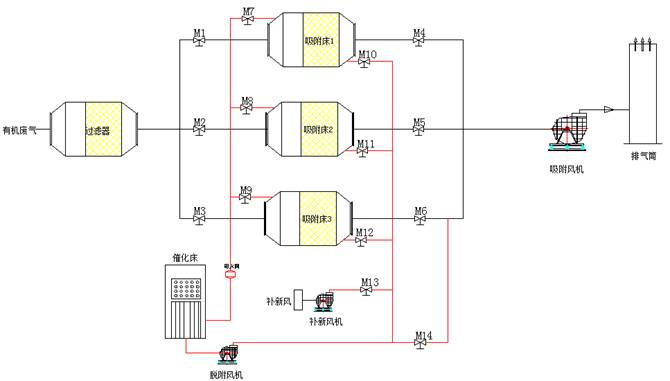 e在活性炭吸附床前采用干式過濾器過濾小顆粒物,凈化效率高,確保吸附裝置的使用壽命。