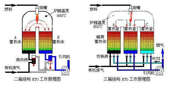 RTO(regenerative thermal oxidizer)為蓄熱式熱氧化反應器。其原理是把有機廢氣加熱到760°(具體需要看成分)以上,使廢氣中的VOC在氧化分解成二氧化碳和水。氧化產生的高溫氣體流經特制的陶瓷蓄熱體,使陶瓷體升溫而“蓄熱”,此“蓄熱”用于預熱后續進入的有機廢氣。從而節省廢氣升溫的燃料消耗。陶瓷蓄熱室應分成兩個(含兩個)以上,每個蓄熱室依次經歷蓄熱-放熱-清掃等程序,周而復始,連續工作。蓄熱室“放熱”后應立即引入適量潔凈空氣對該蓄熱室進行清掃(以保證VOC去除率在98%以上),只有待清掃完成后才能進入“蓄熱”程序。否則殘留的VOCS隨煙氣排放到煙囪從而降低處理效率。
