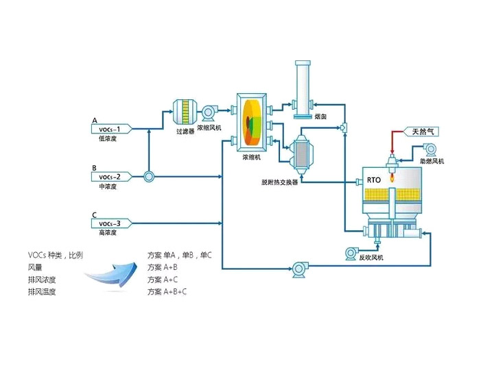工廠所排放出VOCS廢氣進入系統后,第一階段系經過疏水性沸石轉輪,VOCS 污染物質首先于轉輪上進行吸附;第二階段脫附程序是把部分沸石轉輪排放氣與RTO/RCO反應器燃燒室熱氣進行熱交換后加熱為熱氣(約 150 至180 ℃),使其通入轉輪內利用高溫將有機物脫附下來,此時脫附廢氣中的VOCs濃度^高可控制為入流廢氣40倍左右,而脫附下來的高濃廢氣進入RTO/RCO中燃燒,不需要添加助燃氣體,依靠本身的熱值維持燃燒,^終達標高空排放。